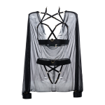 De dingen die je toont en de dingen die je verbergt. Onweerstaanbaar charmant met een flirterige houding, de Sweet Little Lies set is moeiteloos verleidelijk. De afneembare mesh cape met polsbandjes siert de ultra-strappy harnastop. Gouden sliders stellen je in staat de pasvorm aan te passen aan de contouren van je lichaam. Volledig open strappy panty met gouden sliders.